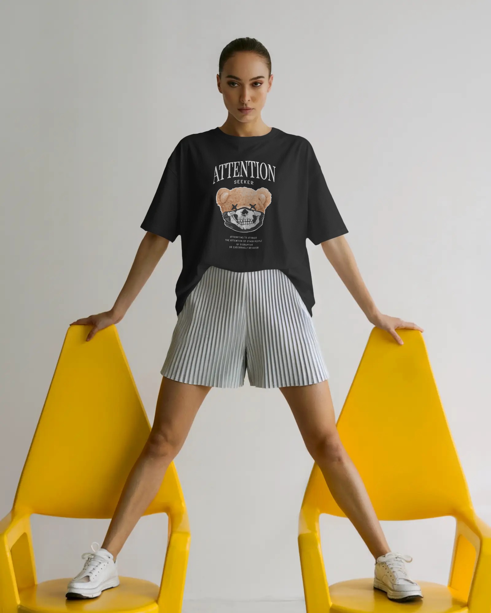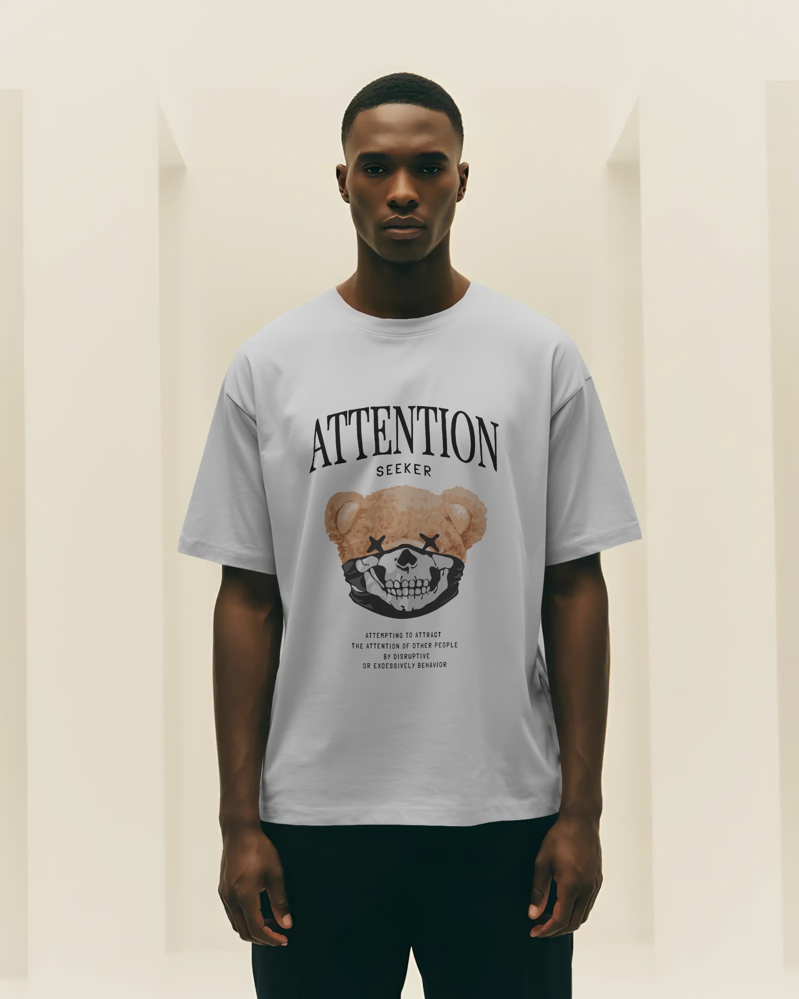 Make a bold statement with the Attention Seeker Oversized Teddy T-shirt. Crafted from 240 GSM French Cotton Terry, this t-shirt offers a soft and breathable feel with a relaxed oversized fit. Featuring a unique teddy and skull graphic with striking typography, it’s designed for those who love expressive streetwear. Perfect for casual wear and adding bold character to your look.